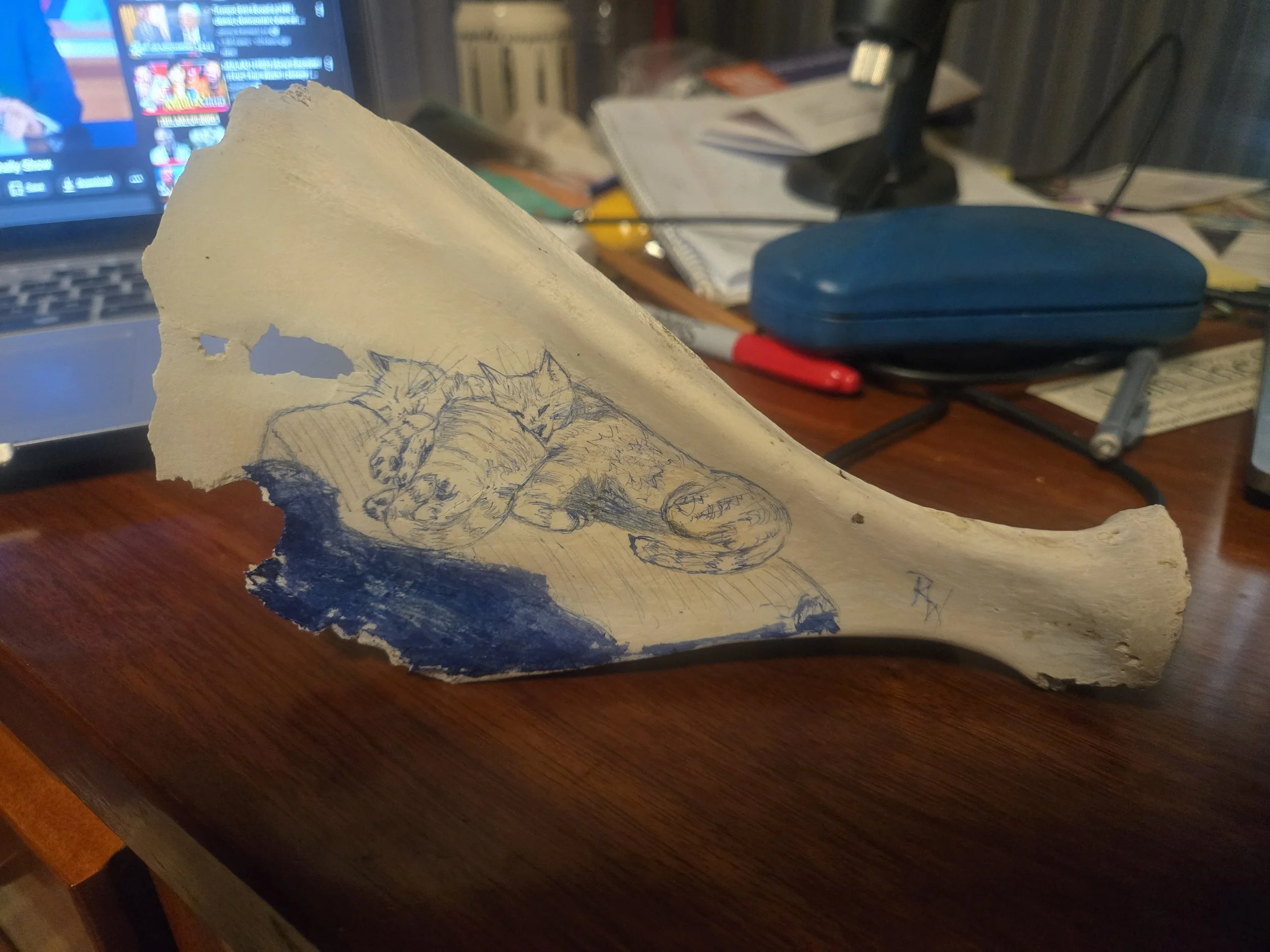 Not much of a step-by-step, but I had my sister send me a photo of their cats, Calvin and Hobbes, then I did a pencil sketch before using an Exacto knife to ink the lines with blue quill ink. Finally, I brushed a polish over the top to smooth out the bone and protect the ink.