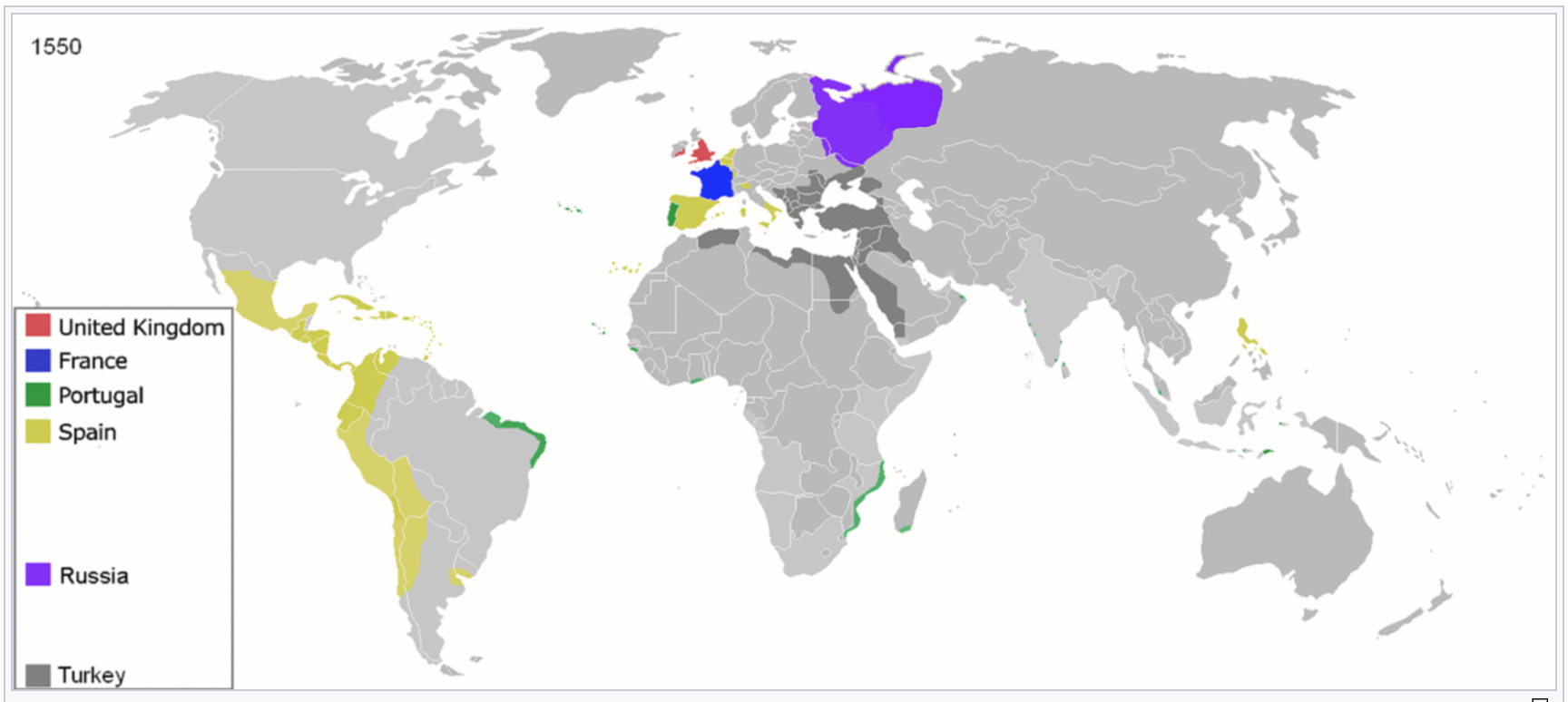 Figure 4. The territories of colonial empires in the 1550s (Made public domain by Wikipedia user Urnanabha