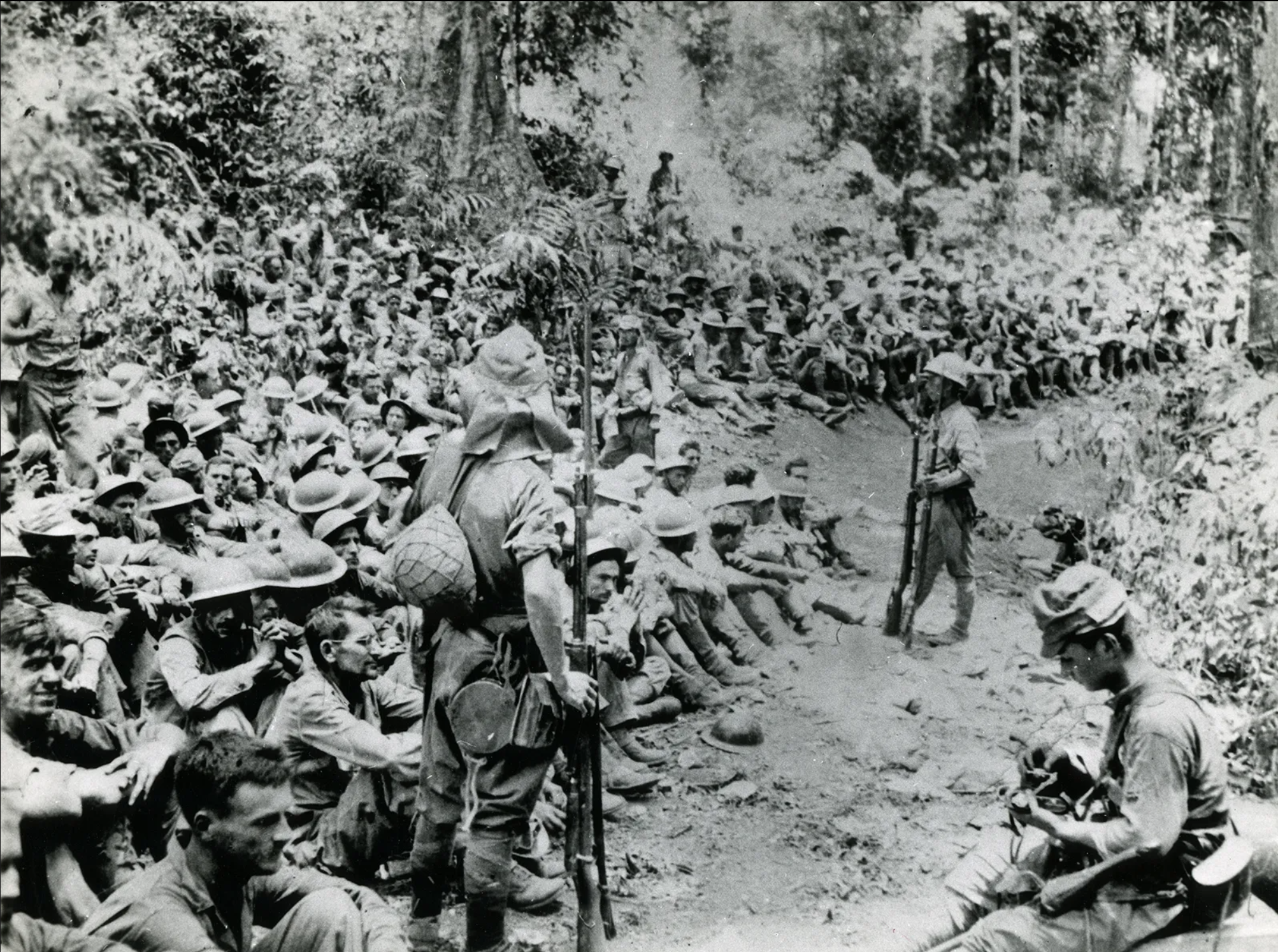 Figure 6. American survivors of the Battle of Bataan under Japanese guard before beginning the Bataan Death March. (Attributed to US Marine Corps. from Encyclopædia Britannica, accessed Jan 13 2026).