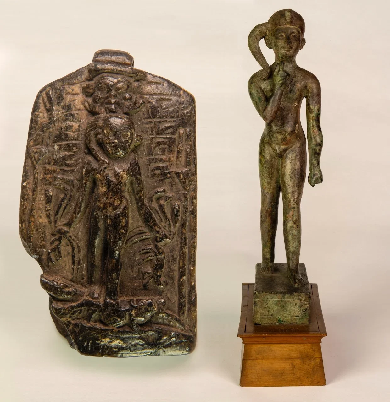 Figure 3. Two related objects from the Egyptian collection at Glencairn Museum. Left: A soapstone amulet depicting Horus on the Crocodiles, also called a Cippus of Horus (E427). Right: A bronze statuette of Harpocrates (E1166). Both objects depict the god Horus the Child (Hor-pa-khered in Egyptian, or Harpocrates in Greek).