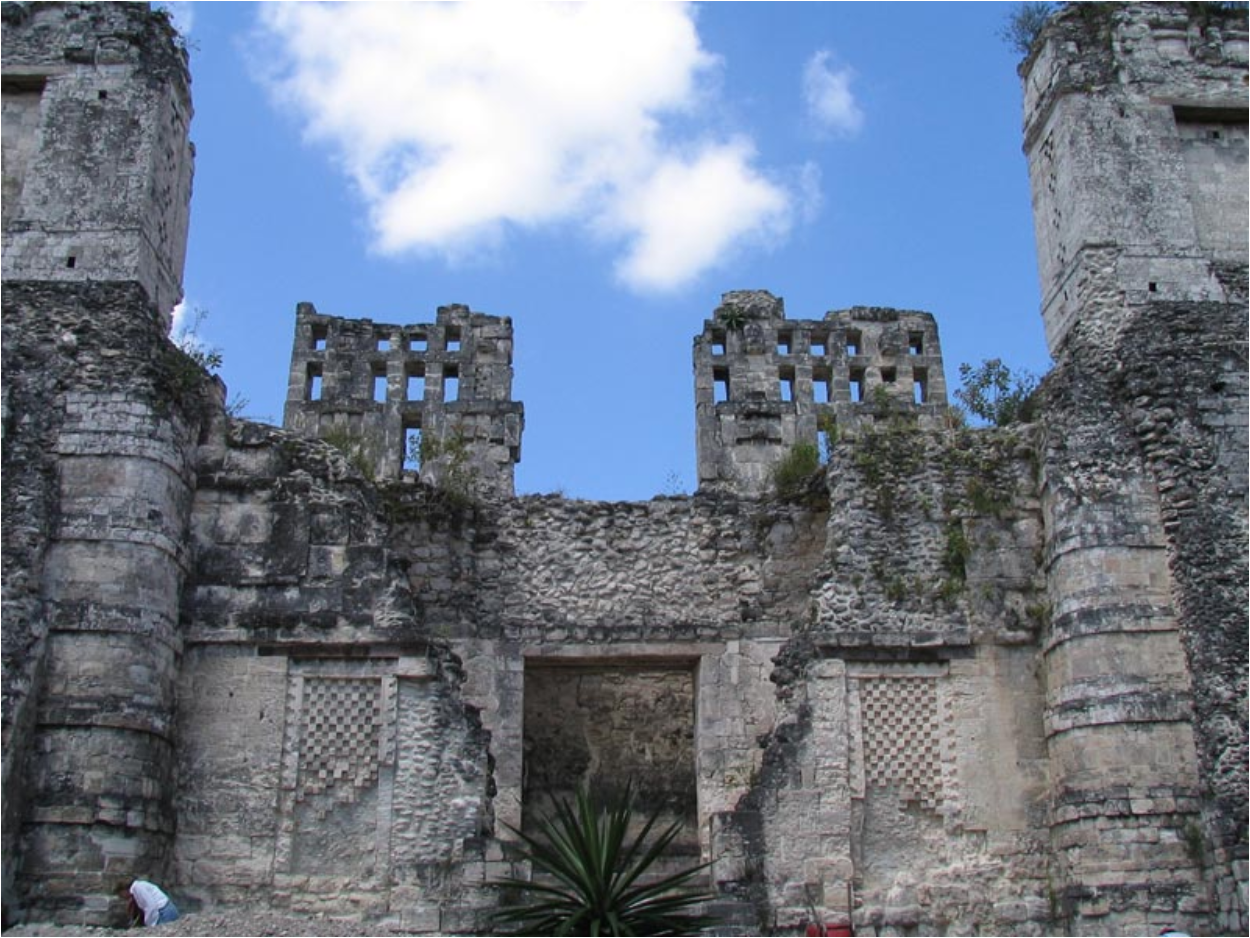 A view of the center of the main Rio Bec B building, showing the remains of a central roof comb (missing its central part), the flanking towers with their fake temples, and two checkerboard design panels which are a standard feature of Rio Bec architecture.